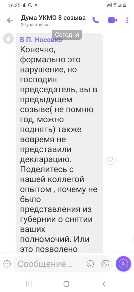 Тем не менее, вне повестки депутаты все же кулуарно обсудили этот вопрос и большинством тоже не поддержали председателя и мэра. Кроме этого выяснилась одна пикантная деталь, которая ставит в очень неудобное положение председателя Думы Красноштанова. Оказывается три года назад, депутат Красноштанов сам не только не сдал необходимые по закону для отчета справки и уведомления, но и вообще не предоставил декларацию о доходах. Сам этот факт почему-то не стал поводом лишения депутатских полномочий Красноштанова и в дискуссии по этому поводу, он лишь скромно указал, что время было другое. Вот эта переписка: